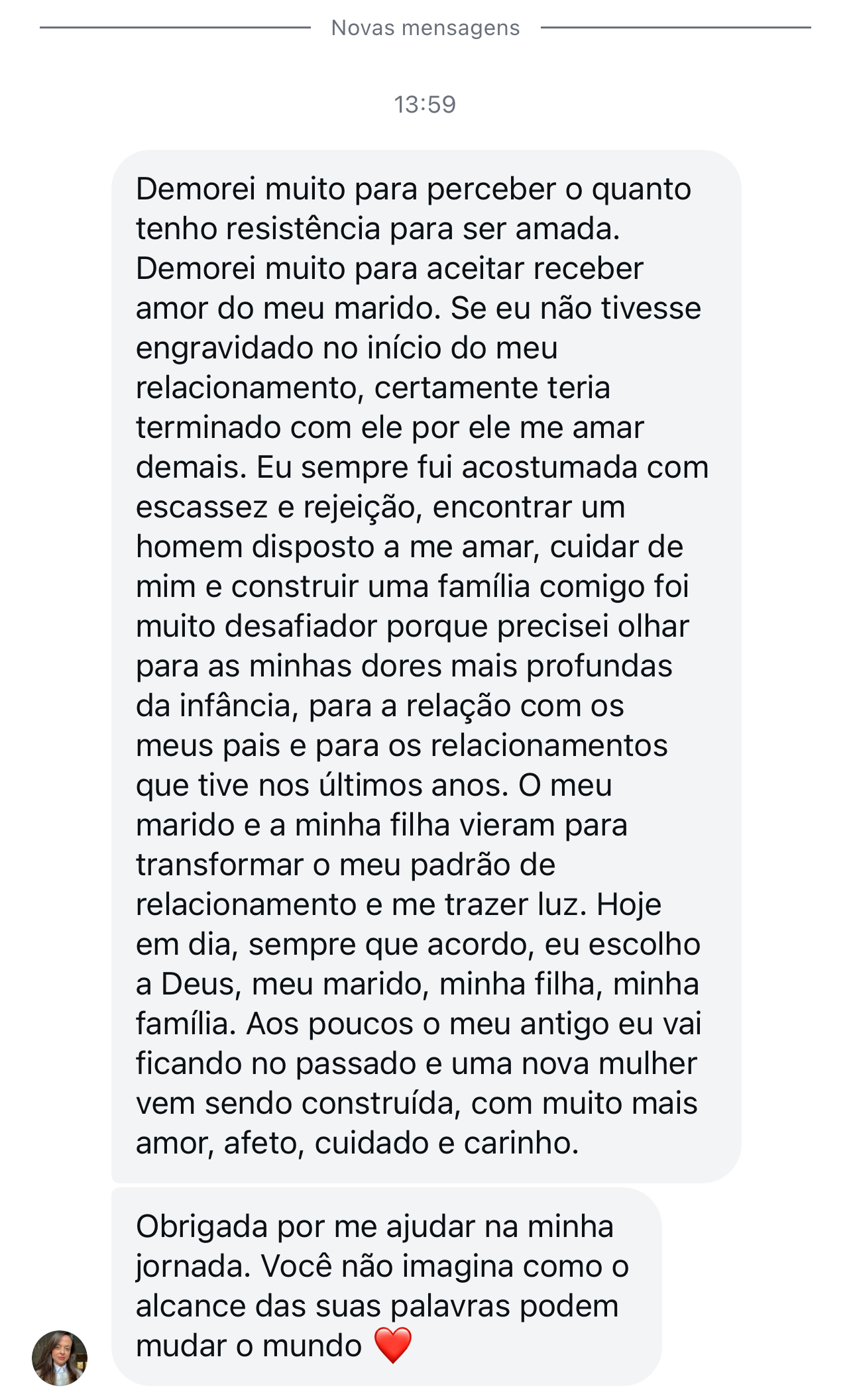 É um processo guiado, direto e profundo, que te devolve a capacidade de enxergar com calma, escolher com consciência e se sentir segura emocionalmente.